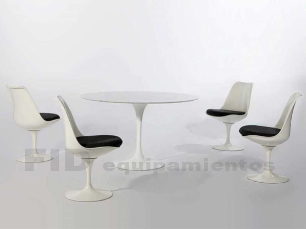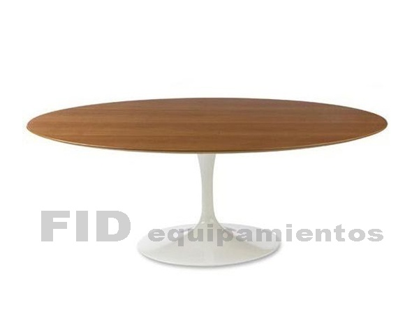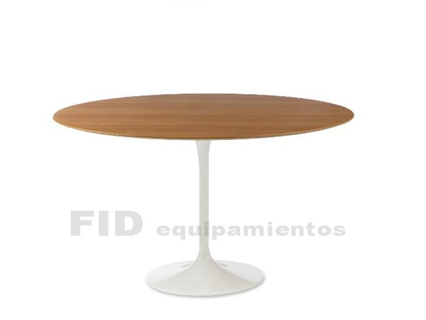 Mesa de reunión para oficinas redonda u ovalada. Distintas medidas. Tapa en MDF laqueado o enchapada en madera natural lustrada. Base en aluminio pintada epoxi blanca. Diseño Eero Saarinen.