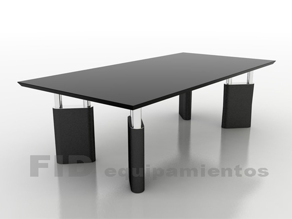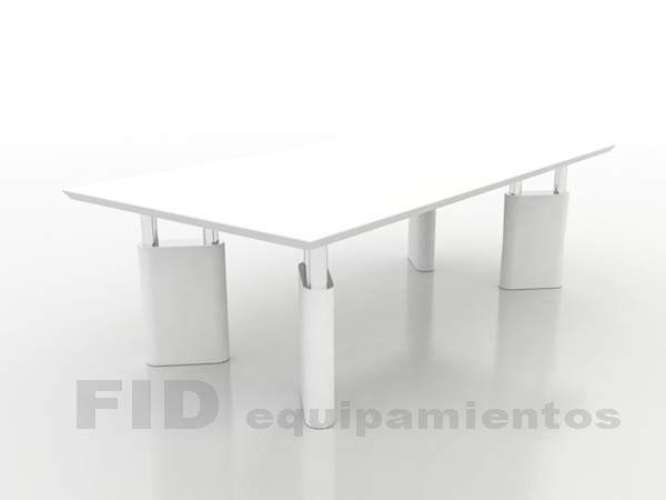Mesa de reunión para oficina Notek. Patas metálicas pintadas epoxi blanco o negro con columnas cromadas. Tapa en MDF laqueado con canto danés a 45°.